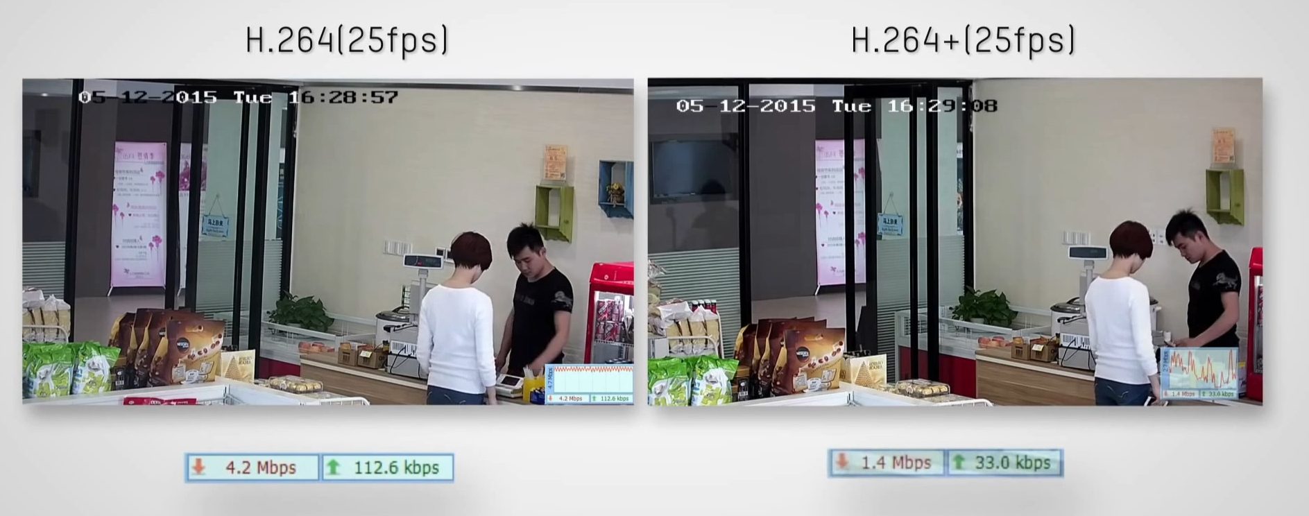 I vantaggi rispetto al codec standard sono no­tevoli: a seconda della luce ambientale (giorno/notte, che influisce sul rumore) e dell’affollamen­to della scena ripresa (interni/esterni), si può ridurre il bitrate medio da un minimo del 40% a un massimo del 98%.