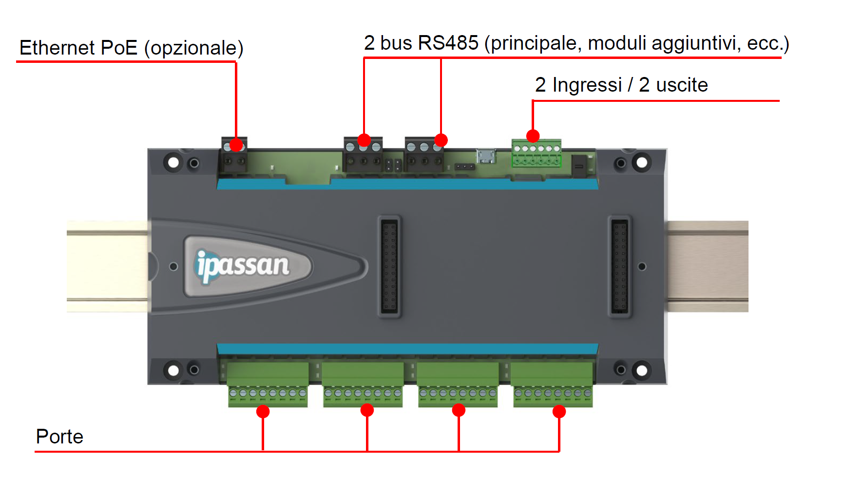 Tramite TCP/IP è possibile interfacciare IPassan con sistemi di terze parti come ascensori e sistemi videocitofonici (con High Level Interface). Il cuore della gamma IPassan sono i controller multi-porta 4 varchi 1088/4, con alimentazione 12 Vcc, o 1088/5 con alimentazione PoE. I controller gestiscono tre protocolli di trasmissione: 2 fili (detto 2-Smart) per il collegamento delle periferiche, RS485 per il collegamento di altri controller o periferiche RS485 e IP per il collegamento a Internet. I controller sono inoltre dotati di tamper antisabotaggio, ingresso stato varco (aperto/chiuso).
