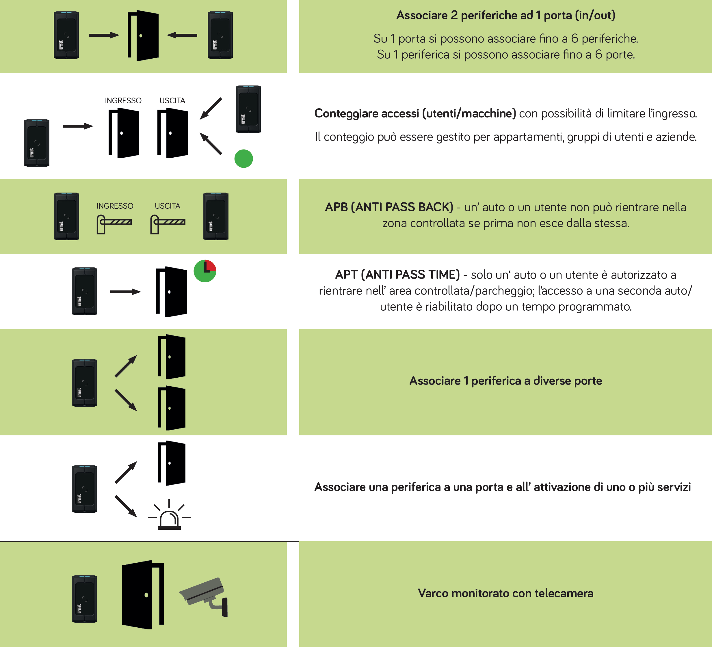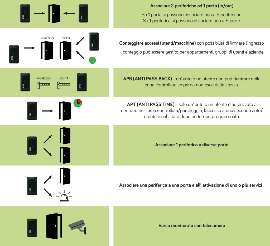 - APB (anti-passback): un'auto o un utente non può rientrare nella zona controllata se prima non esce dalla stessa