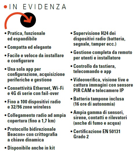 Può gestire fino a 100 dispositivi radio con 32 zone wireless che, grazie agli ingressi ausiliari (1 o 2) dei contatti magnetici, si possono estendere fino a 96 distribuite su 8 possibili aree. Supporta fino a 64 uscite radio, 64 utenti, 32 telecomandi e 4 tastiere. Include (di serie) una batteria di backup da 3,7 Vcc con capacità di 4.250 mAh che permette il funzionamento ininterrotto della centrale fino a 16 ore in caso di backup. Da segnalare anche la certificazione EN 50131 Grado 2.