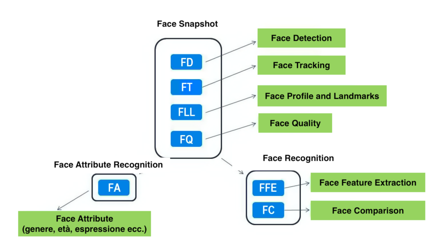 La seconda parte (Face Recognition) è il fulcro dell’operazione di riconoscimento facciale, dal momento che si occupa di estrarre gli attributi (Face Feature Extraction) e compararli (Face Comparison). La terza parte (Face Attribute Recognition) analizza e rileva gli attributi del volto (Face Attribute) come genere, età ed espressione, caratteri fisici e accessori come barba, baffi, occhiali e maschere.