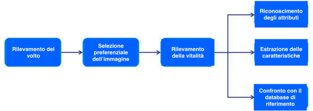 Il processo di algoritmo è composto da diversi step: la fase di rilevamento del volto determina la posizione del volto di riferimento (target) utilizzando un modello di deep learning, avvia il tracciamento e la stima della qualità. L’immagine del volto richiesto viene selezionata in modo preferenziale, tenendo conto della strategia di selezione e della stima della qualità. Il processo di rilevamento della vitalità serve a capire se l’immagine del volto appartiene a una persona reale oppure proviene da una foto.