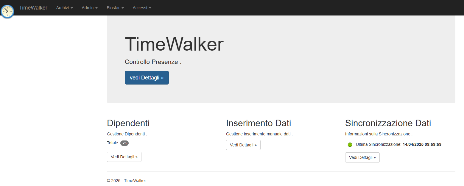 Eter TimeWalker preleva da Biostar2 le timbrature ed effettua il calcolo dell’orario di lavoro secondo tutte le richieste di base della normativa italiana. L’interfaccia ha una grafica pulita ed essenziale, ideata per non distrarre l’operatore e per guidarlo a una veloce elaborazione del cartellino.