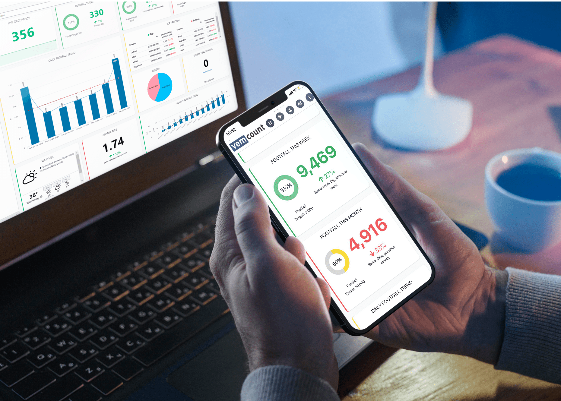 VemCount è una piattaforma software all-in-one per PC, smartphone e tablet, che raccoglie i dati di sensori e telecamere (flusso visitatori, occupazione, comportamento ecc.), li analizza, li unifica e li visualizza su dashboard personalizzabili creando report automatizzati per prendere decisioni consapevoli in termini di sicurezza e marketing.
