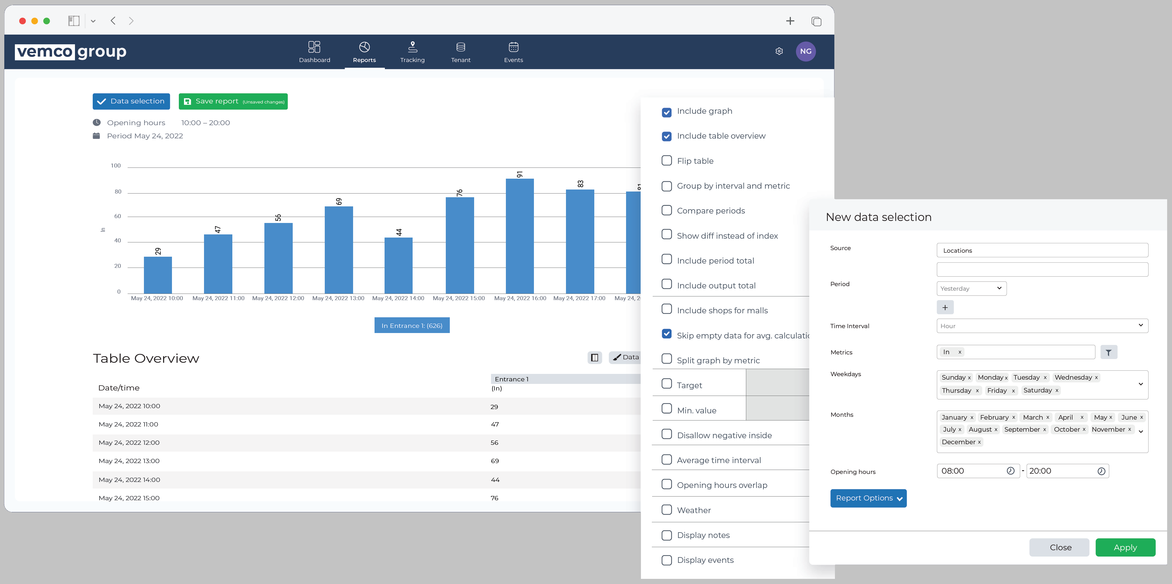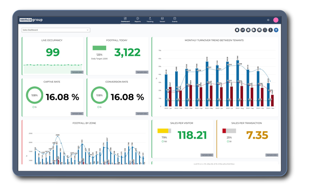 Il cuore di VemCount è la dashboard online che fornisce una rapida panoramica dei dati chiave e delle informazioni più preziose in base alle tipologie di analisi da effettuare, all’ambiente di lavoro ecc. Ogni utente può creare facilmente una o più dashboard personalizzate per avere una panoramica di diversi indicatori chiave di prestazione (KPI) e approfondimenti come il conteggio dei visitatori, l’occupazione in tempo reale, i trend, le vendite, i tassi di conversione, gli eventi e altro.