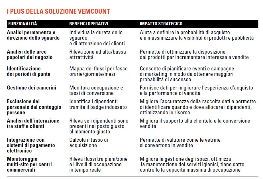 VemCount elabora una gran quantità di dati provenienti dai sensori di rilevamento, si adatta a molteplici applicazioni (negozi al dettaglio, centri commerciali, supermercati, aeroporti, istituzioni pubbliche, luoghi culturali, smart city & building ecc.) e, non ultimo, è user-friendly e ampiamente personalizzabile per soddisfare qualunque esigenza, evitando inutili complicazioni e perdite di tempo.